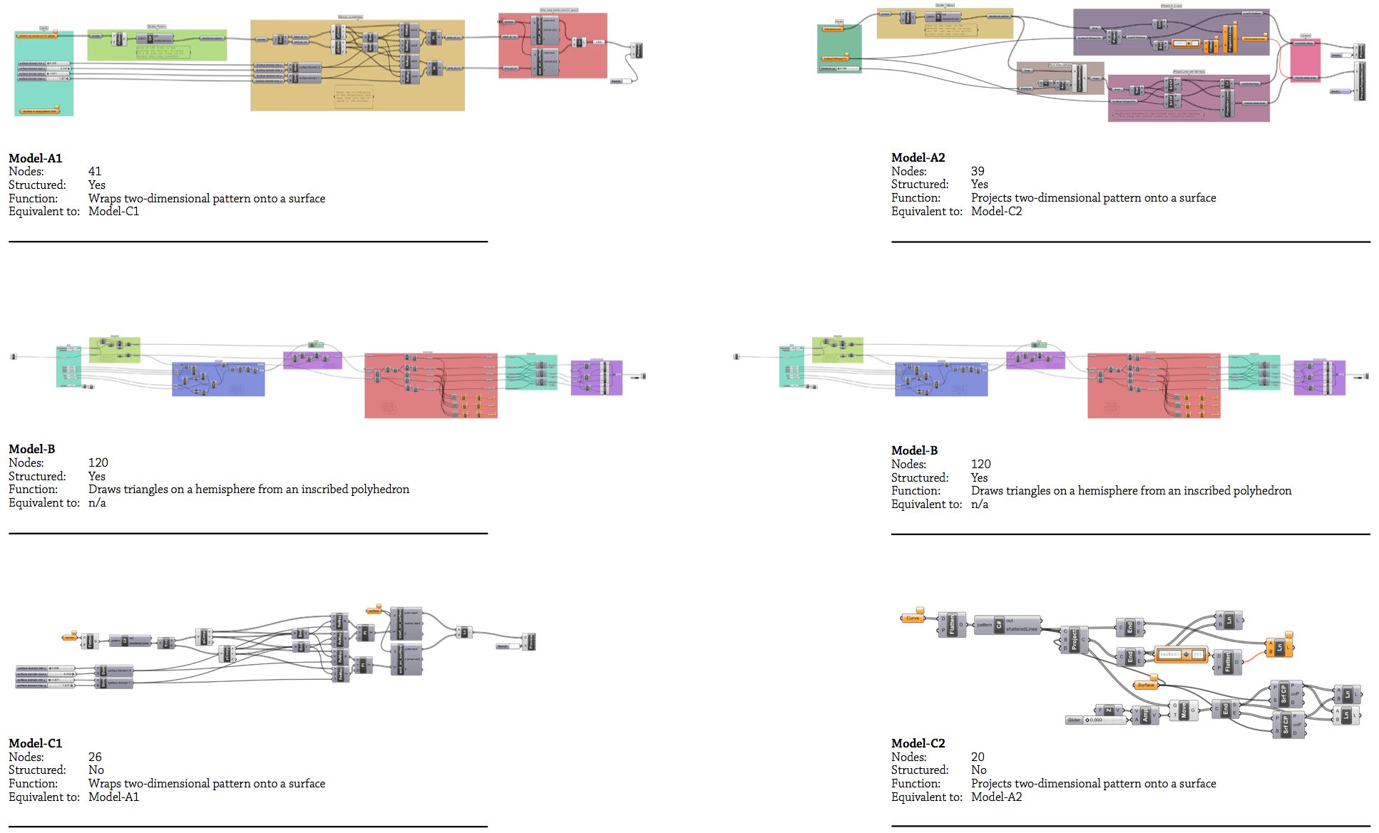 Figure 50: The Grasshopper models shown to the participants (click for detail). To reduce the bias from one model being uncharacteristically understandable the participants were either shown the three models on this page or the three models on the facing page (selected at random). The first model the participants saw, model-A, was a structured versions of the last model the participants saw, model-C. These models were of an average size (see chap. 4.3) and did a task the participants were generally familiar with (applying two-dimensional patterns to three-dimensional surfaces). To mask the fact that model-A and model-C were equivalent, the participants were shown model-B in between, which was much larger and did a task the participants were unfamiliar with (to ensure the participants spent a long time studying the model and forgetting about the first model). As the experiment was conducted at a time when Grasshopper did not support clusters, the structure was generated through visually separating groups of code around defined entry and exit points, and through clearly naming parameters and groups. Fortuitously this avoids some of the aforementioned issues of visibility and juxtaposability present in Grasshopper’s current cluster implementation.